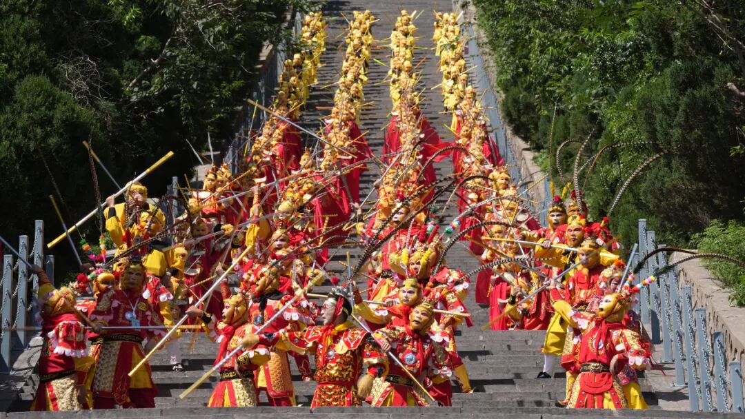 景区桃都山下金箍舞动、旌旗招展。来自全国各地的“孙悟空”扮演者身着戏服、手持金箍棒,整齐列队,气势恢宏。六小龄童作为济源公益文化形象大使亲临现场并为活动助力。他表示:“孙悟空不仅是《西游记》中的经典形象,更是中华文化中智慧与勇气的象征。今天大家以这样的方式相聚,既是对传统文化的热爱与传承,更是文化自信的生动体现。”